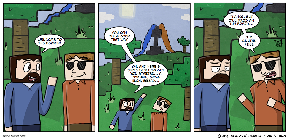 "I also don't eat red meat, and I'm allergic to natural fibres, birch trees, and dust. I think I'll just stay in actually… have fun with all the mining and crafting and such!" ~C Be sure to like us on Facebook and follow us on Twitter, eh ;) Share/Bookmark