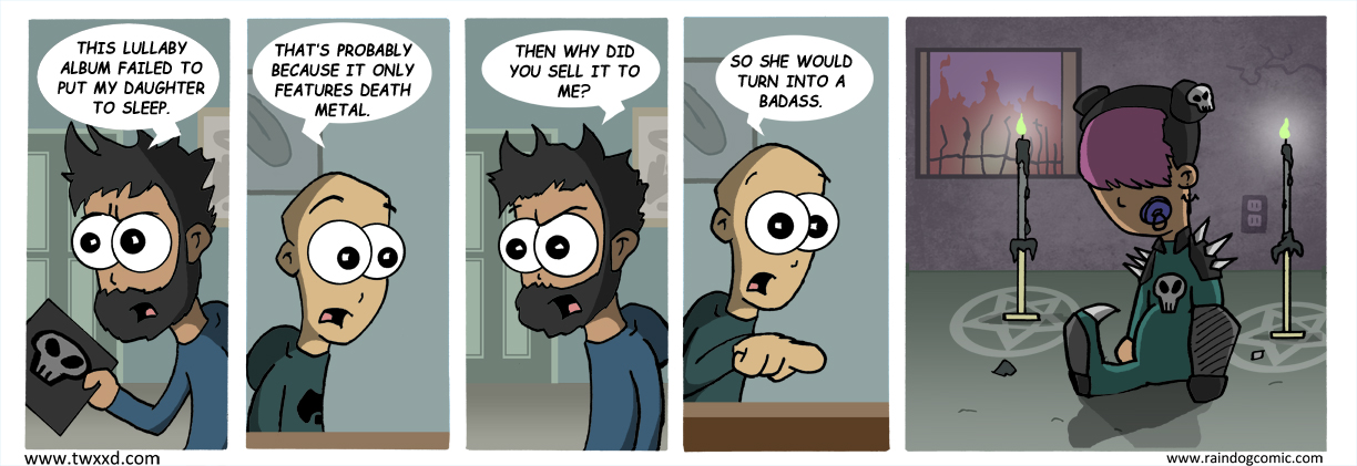 2. I’m pretty sure I have this: http://www.amazon.com/Rockabye-Baby-Lullaby-Renditions-Queen/dp/B001WIH28M somewhere in my house. I suppose http://www.rockabyebabymusic.com/music/rockabye-baby-lullaby-renditions-of-metallica.html would be a reasonable item to make this comic come true.
