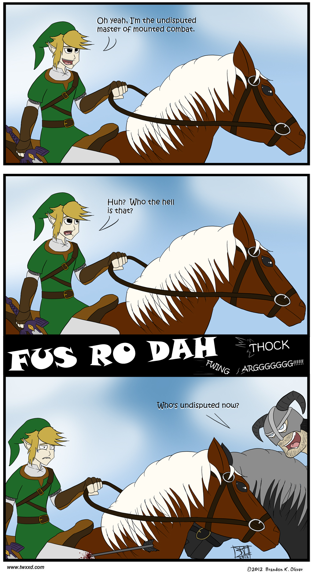 That's right Link. I've seen you traipsing around, acting like you invented horse mounted combat. I think the Dovahkiin might have something to say about that.