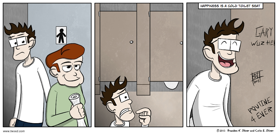 We've all been there. You approach a public bathroom, just as someone is leaving. Once you get inside, it's just you now, but there are multiple stalls. The person you saw leaving could have been in any one of them. You can't know for sure. Hesitant, you roll the dice, and pick a stall... what will it be? The cold and comforting feeling of unused porcelain? Or the unwelcome warmth and slight dampness of recent usage... Best of luck everyone. ~C Be sure to like us on Facebook and follow us on Twitter, eh ;) Share/Bookmark