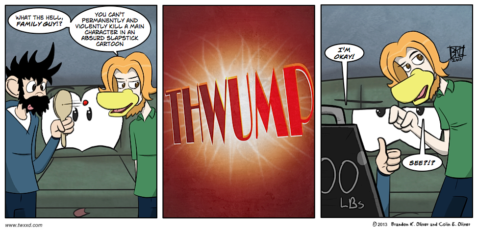 For the record, I haven't watched Family Guy in years. Their jokes went from having clever shock value, to shock value, to just plain shock, and I gave up on them. But my eye caught a news site with a headline implying that they offed a main cast member, and it peaked my curiosity. So I watched the clip, and it was downright unsettling. Not because they succeeded in packing any emotion into it, but because the Family Guy world I remember was not one based at all in reality, and I feel like they can't "visit" there just because they feel like it. Oh well. They're probably just struggling to stay relevant, and failing.