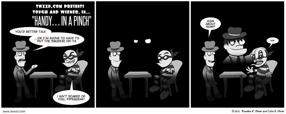 This strip features a new villain I'm thinking of calling "Caught Carl". His evil plan is to commit small crimes, get arrested, get released on a technicality, and then start the whole thing over again. His master plan is to put unexpected stress on the law enforcement establishment to ultimately slow them to a crawl. Tough and Wiener don't have the heart to tell him that it's not really working like he'd hoped... Tough may not look like much... but hey, that's because he's all talk and kinda little. That's okay though. He doesn't need to be tough, with Wiener around. All right... that's about enough word play for today :). ~C Be sure to like us on Facebook and follow us on Twitter, eh ;) Share/Bookmark