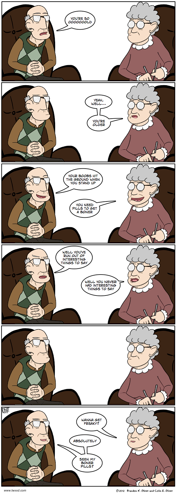 What? Don't look at me like that. Old people need love, too. This spawned from an interesting fact I learned... apparently one of the top health concerns in old folks homes is the spread of herpes. Old people sex is happening, people. A lot. Whether you like it or not. It makes some sense... I mean... they really don't have to care about a lot of the social stigmas everyone else has around hooking up. It just sounds horrifying and gross to the rest of us. But remember... one day, if you're lucky... you shall also be old. And you will still want to score. ~C Be sure to like us on Facebook and follow us on Twitter, eh ;) Share/Bookmark